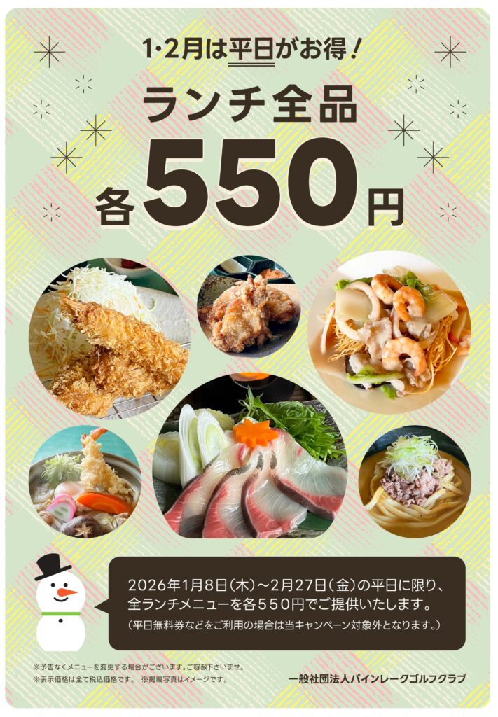 2026年1月・2月の平日限定で全メニューを一律550円(税込)でご提供いたします。
